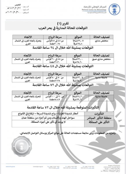 طقس العرب - سنان خلف - أصدر المركز الوطني للأرصاد في المملكة العربية السعودية التقرير رقم (1) والذي توقع فيه تطور المنخفض المداري إلى منخفض مداري عميق ثم عاصفة مدارية خلال الـ 72 ساعة القادمة.