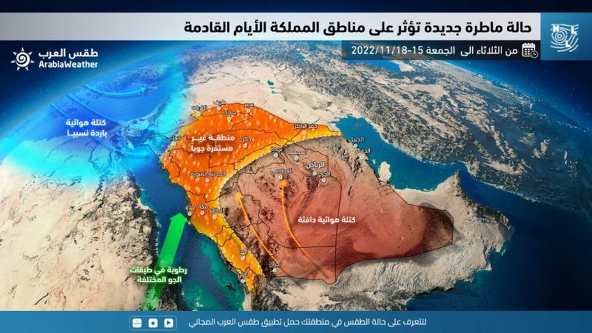 نتيجة اندفاع كتلة هوائية باردة نسبياً من الشمال و الشمال الغربي بالتزامن مع هبوب تيارات هوائية دافئة و رطبة من الجنوب، واستجابة فعّالة لِمُنخفض البحر الأحمر و إندفاع تيارات مُشبعة بالرطوبة في طبقات الجو المُختلفة، و يعني ذلك توافر العديد من الظروف الجوية لتشكل سحب رعدية تشمل أنحاء واسعة من شمال و وسط المملكة بإذن الله.
