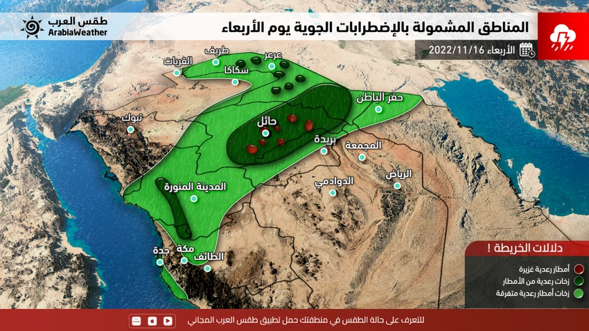 و بحسب المُتنبئين في طقس العرب يُتوقع أن تشتد الإضطرابات الجوية يوم الأربعاء لتشمل أجزاء عديدة من شمال ووسط المملكة، بما في ذلك الحدود الشمالية و حائل و القصيم و المدينة المُنورة، و تكون هذه الأمطار غزيرة في بعض الأحياء و النطاقات الجغرافية الضيقة و مُترافقة مع تساقط للبَرَد مما يتسبب بجريان الاودية و الشعاب و تشكل السيول المُفاجئة، كما و تُصحب هذه الزخات الرعدية بهبات قوية من الرياح.. كما تشمل الأمطار بشكلٍ مُتفرق أجزاء من الجوف و تبوك خاصةً الأجزاء الجنوبية من المنطقتين بمشيئة الله.