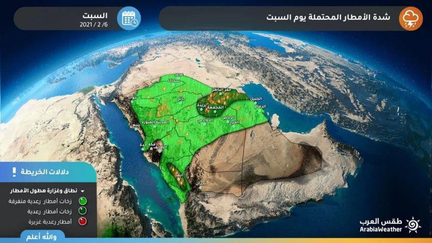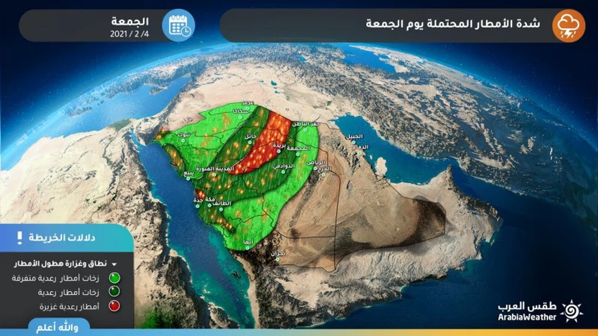 تُشير اخر التوقعات الجوية الى إزدياد شدة غزارة الهطولات المطرية خلال ساعات المساء المتأخرة وليلة الجمعة/السبت على مناطق متفرقة من حائل والقصيم والحدود الشمالية و حفر الباطن حيث يتوقع ان تهطل زخات رعدية من الأمطار تغزر أحياناً تترافق معها هطول البَرد ونشاط لافت للرياح السطحية المُثيرة للأتربة والغبار.