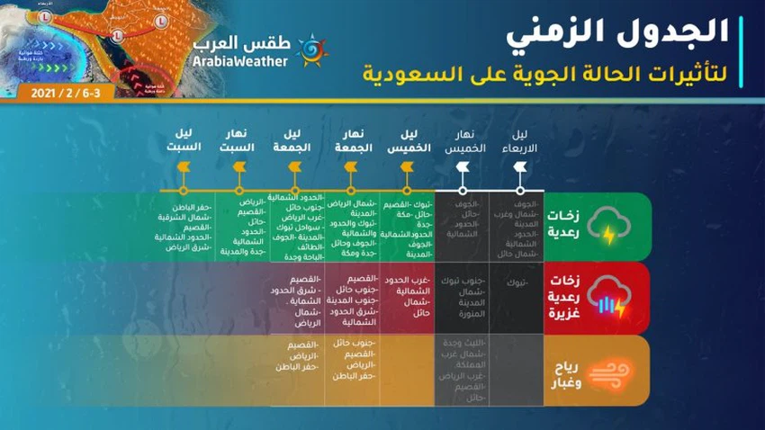 وبحسب آخر ما تشير إله مخرجات النماذج العددية فيُتوقع بمشيئة الله استمرار تأثير الحالة الماطرة عطاء على المملكة خلال الـ 48 ساعة القادمةوفق التسلسل الزمني التالي: