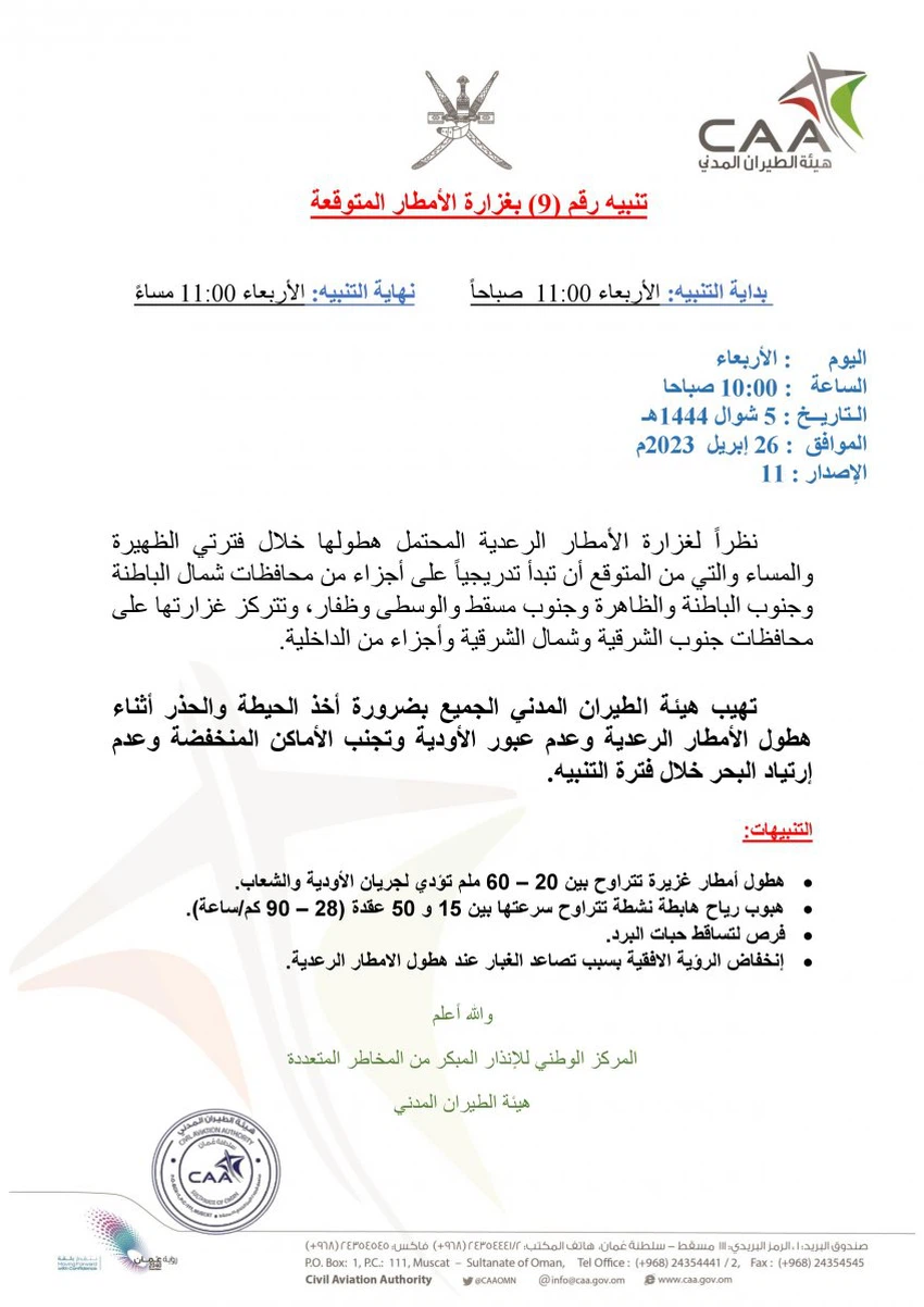 طقس العرب - أصدر المركز الوطني للانذار المبكر من المخاطر المتعددة في سلطنة عُمان تنبيهاً من غزارة الأمطار المتوقعة في عدد من محافظات السلطنة.