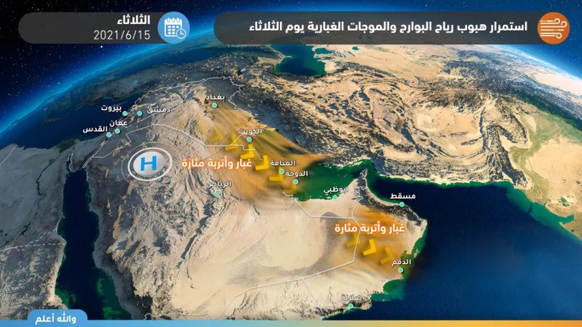 طقس العرب – سنان خلف – من المُتوقع بمشيئة الله أن تتراجع شدة الرياح بشكل نسبي يوم الثلاثاء على الأجزاء الجنوبية من العراق والكويت والأجزاء الشرقية من المملكة العربية السعودية، مع بقائها نشطة بشكل عام، وستعمل تعمل على إثارة الأتربة والغبار مُجدداً.