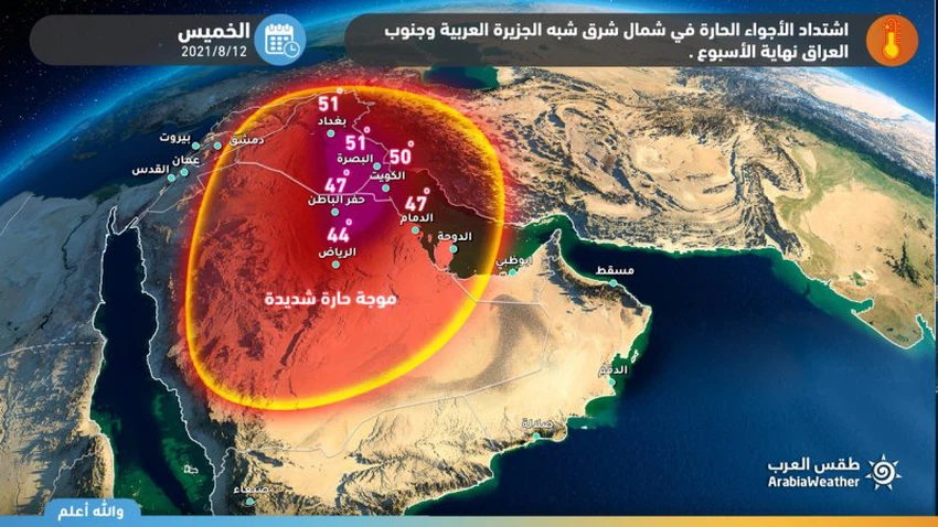 طقس العرب - تُشير آخر مخرجات أنظمة المُحاكاة الحاسوبية الخاصة بتوقعات الحرارة إلى تأثر منطقة شبه الجزيرة العربية نهاية الأسبوع الحالي بكتلة هوائية شديدة الحرارة، يُمكن وصفها بالإقليمية، نتيجة تأثيرها على رقعة جغرافية واسعة تشمل العديد من دول المنطقة.