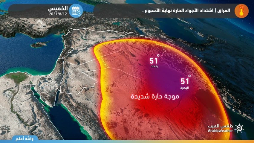 وتُعتبر جُمهورية العراق هي من المناطق الأكثر تأثراً بالموجة الحارة، إذ يتوقع أن ترتفع درجات الحرارة خلال نهاية الأسبوع بشكل كبير، ويُتوقع أن تُسجل معظم المناطق العراقية بما فيها العاصمة بغداد درجات حرارة مرتفعة تتراوح ما بين 50 إلى 52 درجة مئوية، ويكون الطقس شديد الحرارة ومُرهق للغاية.