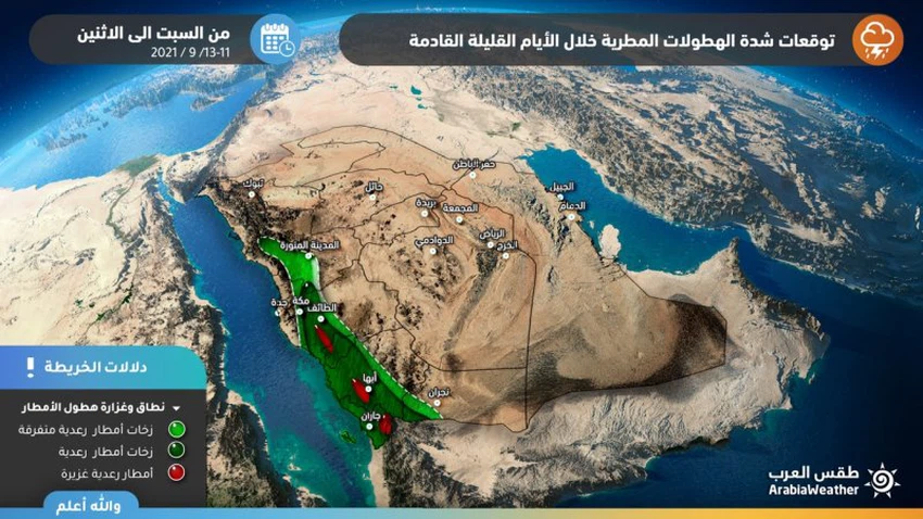 وفي التفاصيل فتُشير آخر مخرجات أنظمة المحاكاة الحاسوبية لتوقعات الأمطار لدينا في طقس العرب إلى حدوث اشتداد إضافي على وتيرة ورقعة الامطار الرعدية على أجزاء واسعة من جازان وعسير والباحة يومي الأحد والإثنينن بحيث تتكاثر السُحب الركامية الرعدية وتتساقط المطار بغزارة عالية أحياناً في ساعات مابعد الظهر والمساء، يكون مترافقة بالبرق والرعد وتساقط لزخات البرد في بعض المواقع.
