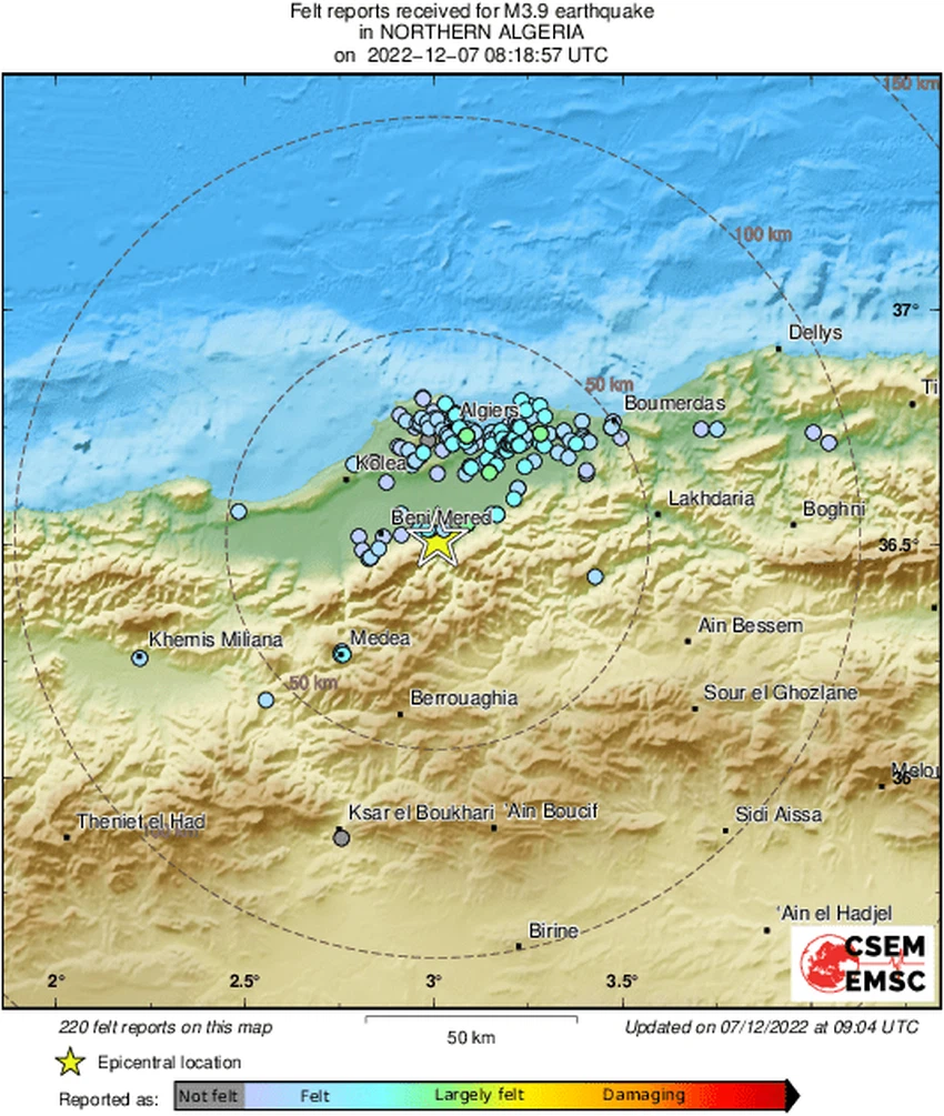 طقس العرب - ضرب زلزال بقوة 4.0 درجات على مقياس ريختر بالقرب من الجزائر العاصمة، صباح اليوم وفقا للمركز الأوروبي المتوسطي لرصد الزلازل (EMSC) ، الذي يعتبر أحد الوكالات الدولية الرئيسية التي تراقب النشاط الزلزالي في جميع أنحاء العالم.