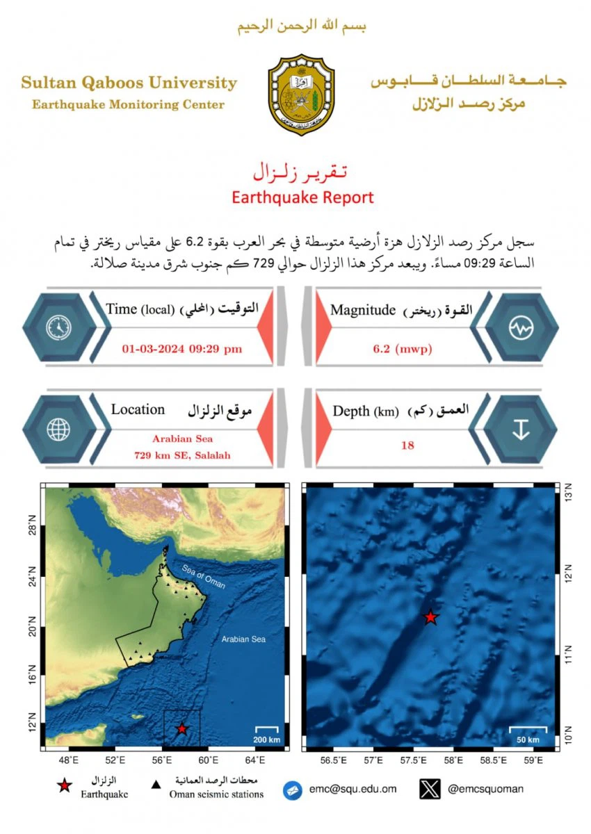 وسجل مركز رصد الزلازل التابع لجامعة السلطان قابوس هزة أرضية متوسطة في بحر العرب بقوة 6.2 على مقياس ريختر مساء اليوم، ويبعد مركز الزلزال حوالي 729 كم جنوب شرق مدينة صلالة.