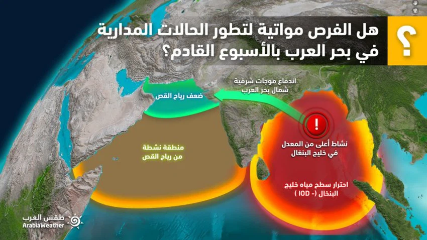 وتُشير التوقعات الخاصة بطقس العرب، والتي تم تطويرها ودمج البيانات الديناميكية والاحصائية معاً، إلى ارتفاع فُرص تشكل حالات مدارية في بحر العرب خلال شهر أكتوبر/تشرين أول، لاسيما في النصف الثاني من الشهر، وسيتم نشر المزيد من التفاصيل لاحقاً.