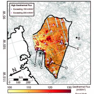 خارطة توضح مصادر وأماكن الطاقة الحرارية في باطن الأرض في الجزء الغربي من القطب.