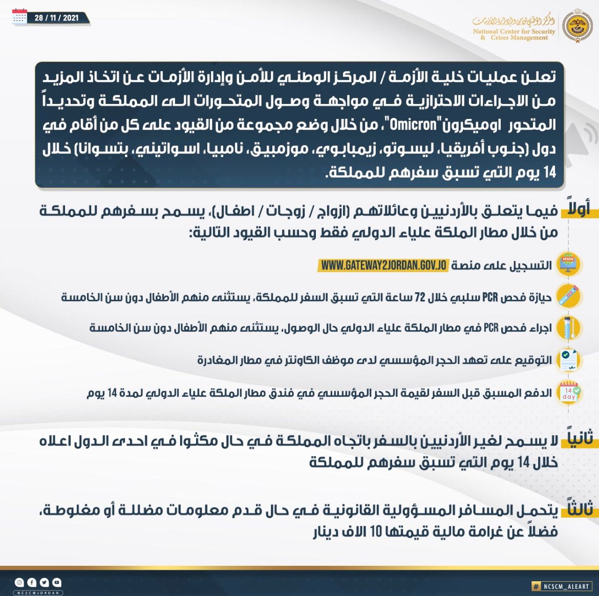 أعلنت وزارة الداخلية الأردنية في بيان أمس الجمعة "منع دخول غير الأردنيين القادمين من هذه الدول إلاّ بعد مرور 14 يوما على مغادرتهم لهذه الدول إلى دول أخرى لا يتواجد فيها المتحور الجديد، وذلك اعتبارا من الأحد المقبل".