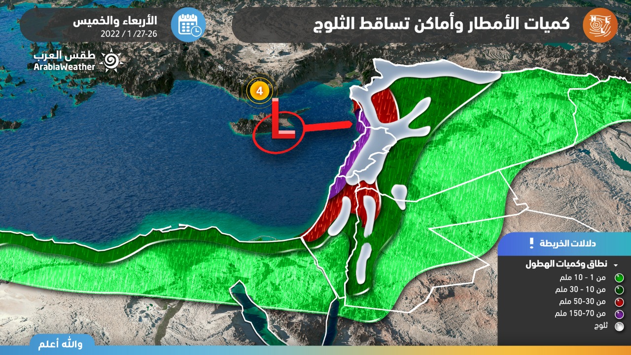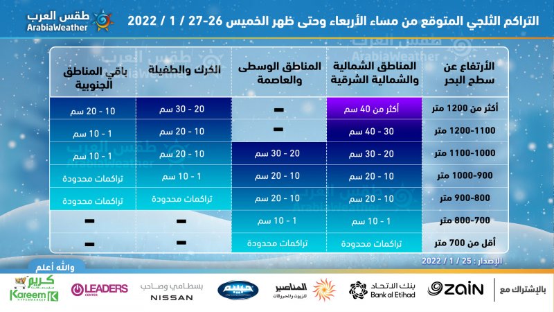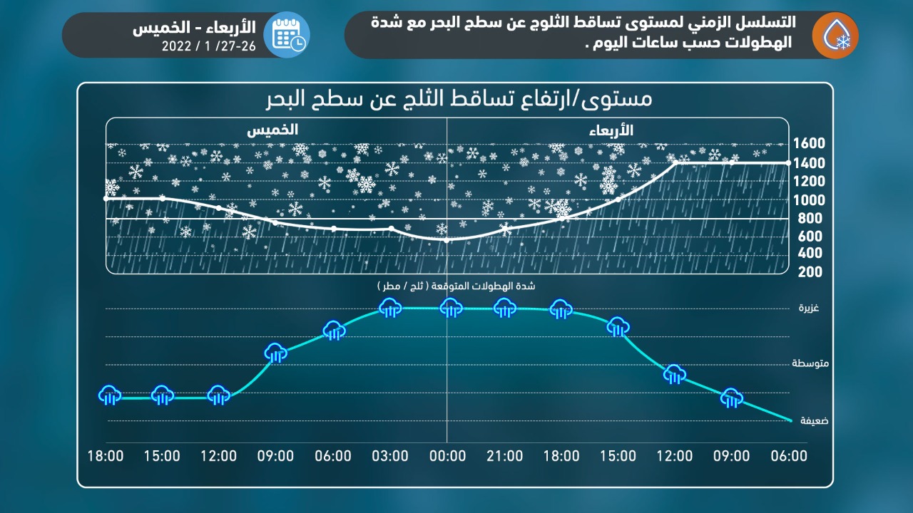 يبدأ تدريجياً تساقط الثلوج - بمشيئة الله - بدءاً من ساعات عصر الأربعاء، فوق المُرتفعات الجبلية التي يزيد ارتفاعها عن 800 متر عن سطح البحر و تشمل مناطق عِدّة من العاصمة و سائر المدن الرئيسية و تترافق مع حدوث الرعد أحياناً.