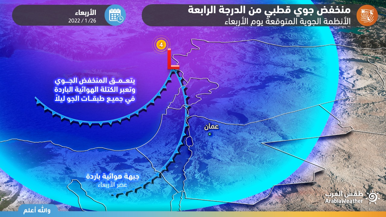 طقس العرب - تأثرت الأردن يوم الأربعاء 26-01-2022 بمنخفض جوي صُنف من الدرجة الرابعة جلبَّ معهُ هطولات مطرية وتساقطات ثلجية على أجزاء واسعة من المملكة وسط تراكمات ثلجية في العديد من المرتفعات بحمد الله، وما زالت تتأثر المملكة حتى السبت بتبعات وبقايا المنظومة الجوية القطبية على شكل تيارات غربية رطبة تعمل على سيادة أحوال جوية غير مُستقرة في بعض المناطق، والتي من المُنتظر أن تنحسر كُلياً مساء يوم السبت بمشيئة الله، ويرد إلى طقس العرب العديد من الاستفسارات عن التوقعات الجوية خلال الفترة المُقبلة. التفاصيل من هنا