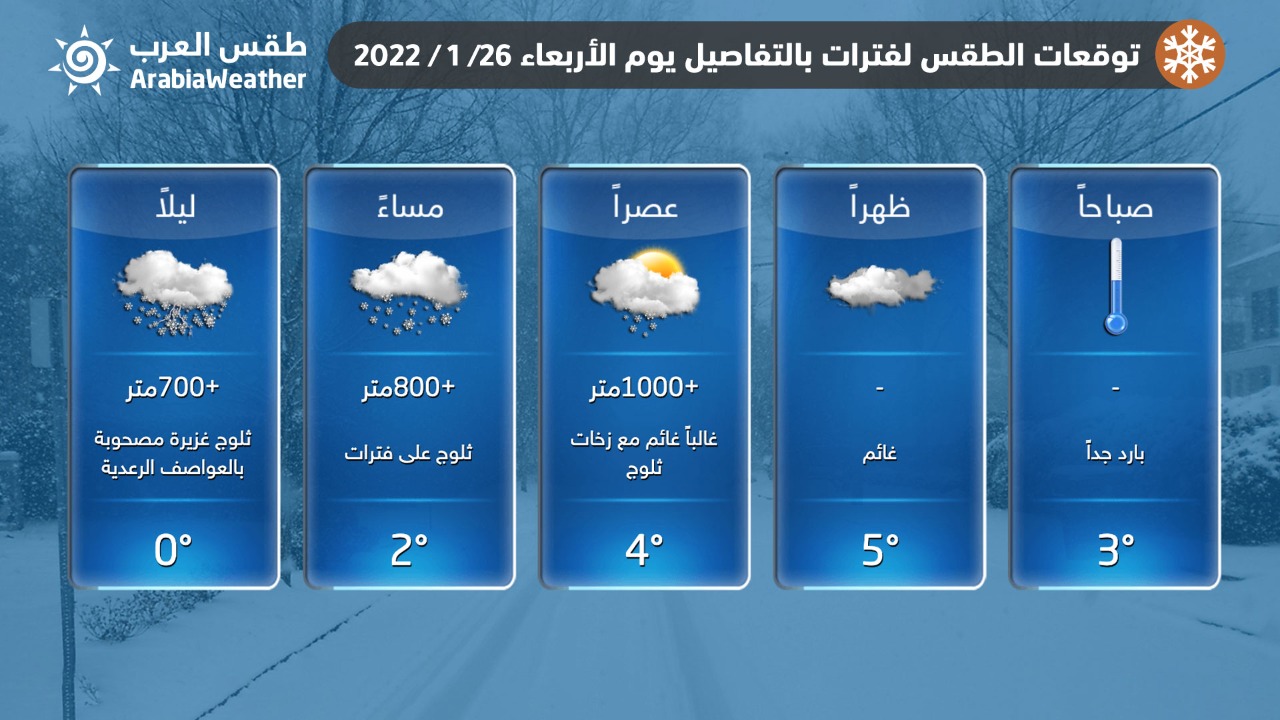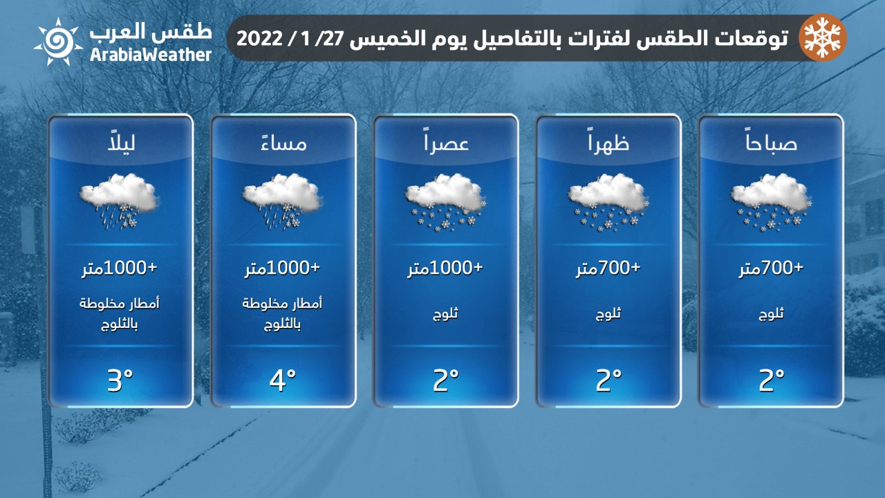 تعمُق البرودة خلال الساعات القادمة، وازدياد كثافة الثلوج وامتدادها إلى مرتفعات 700 متر واقل من ذلك احيانا مع ساعات الليل المتأخرة أن شاء الله.