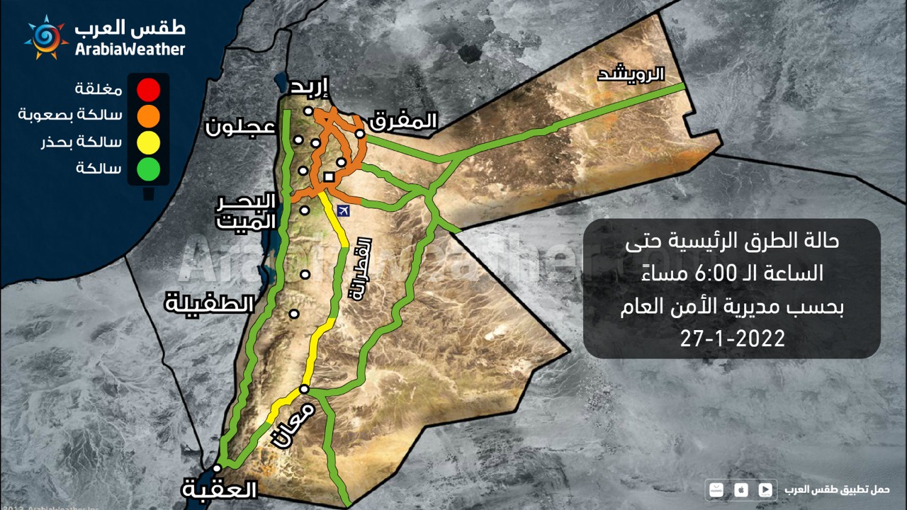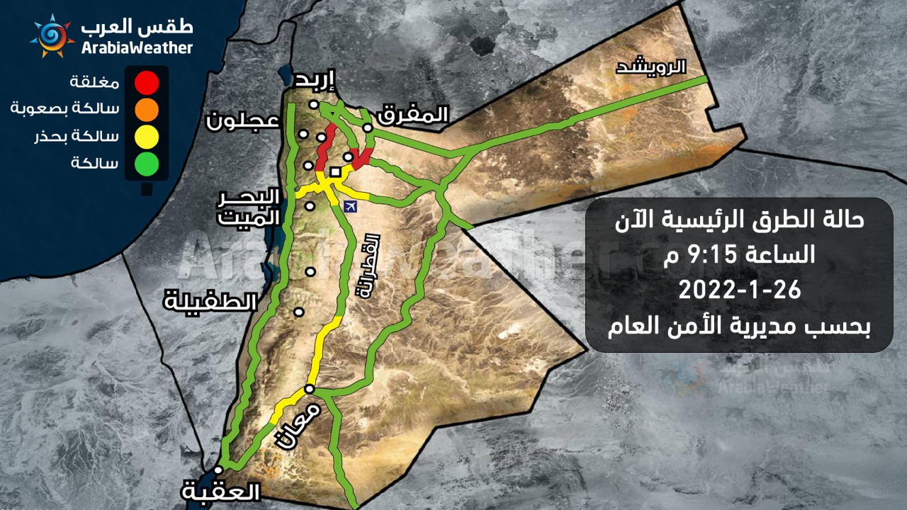 - اقليم البتراء: جميع الطرق الرئيسية سالكه بحذر شديد بسبب تشكل الضباب بكثاقة باستثناء الطرق التالية :