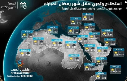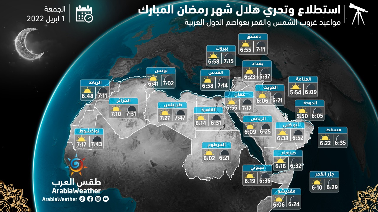 وفيما يلي أوقات غروب الشمس وغروب القمر في عواصم الدول العربية وقت تحري هلال شهر رمضان: