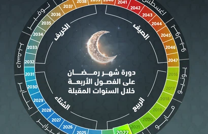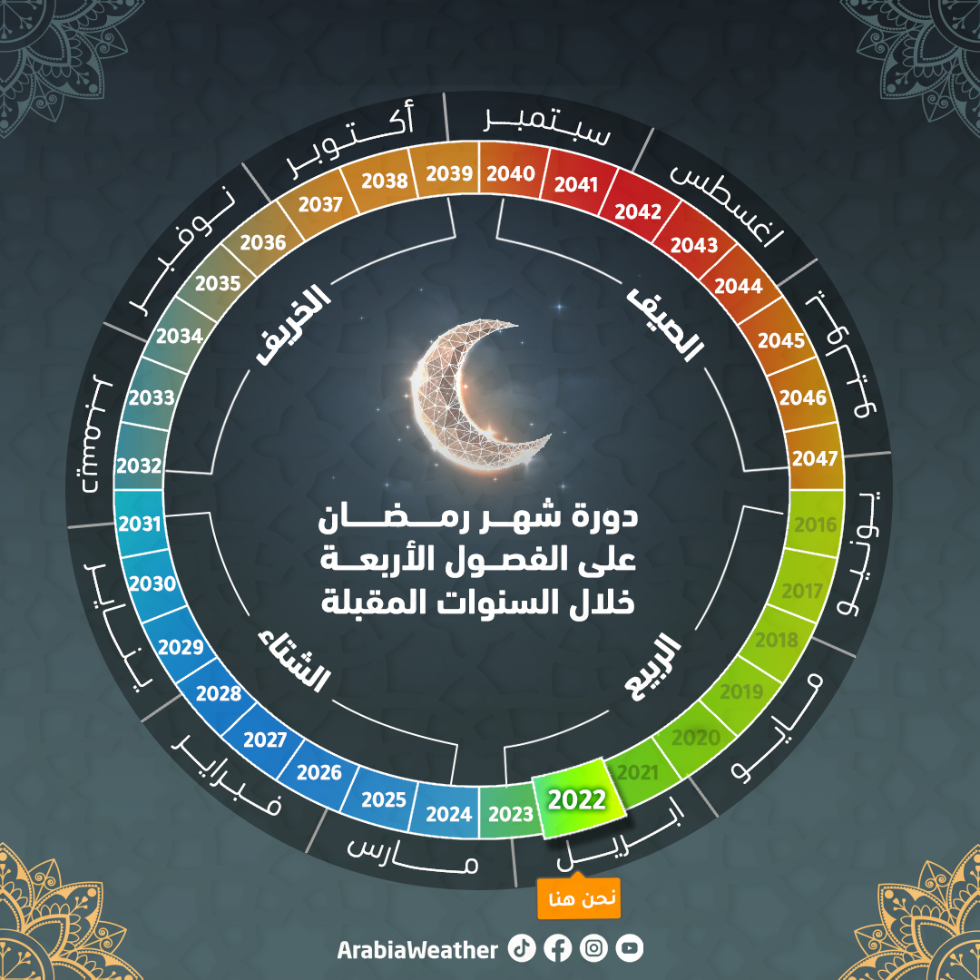 كما هو معلوم فان شهر رمضان يزحف رويداً رويداً بفارق زمني يقدر بـ 11 يوماً مقارنة بالأشهر الميلادية، فيستمر بالتقدم بهذا الفارق الزمني من فصل الربيع حتى يبدأ بالتزامن مع فصل الشتاء في العام 1445هـ/2024م، أي بعد عامين تماماً، ليستمر تصادفه في الشتاء لمده 8 سنوات، يقترب خلالها عاماً بعد عام بواقع 11 يوماً نحو الخريف، ليبدأ بالتصادف مع الخريف اعتبارا من العام 2032م.