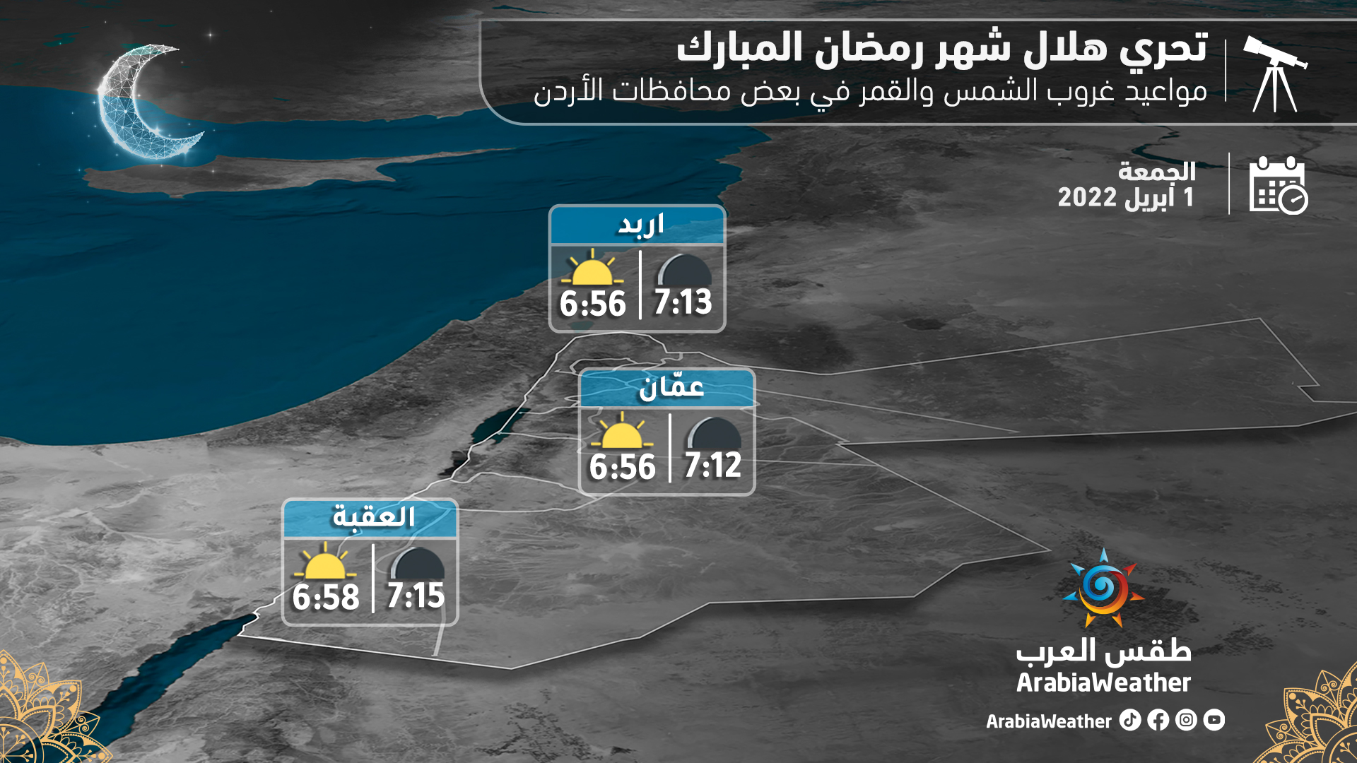 طقس العرب - تبدأ الآن عمليّة تحرّي هلال شهر رمضان المبارك للعام 1443 هـ الموافق للعام 2022 في المملكة الأردنية الهاشمية، وذلك للإعلان عن موعد بدء شهر رمضان المُبارك.