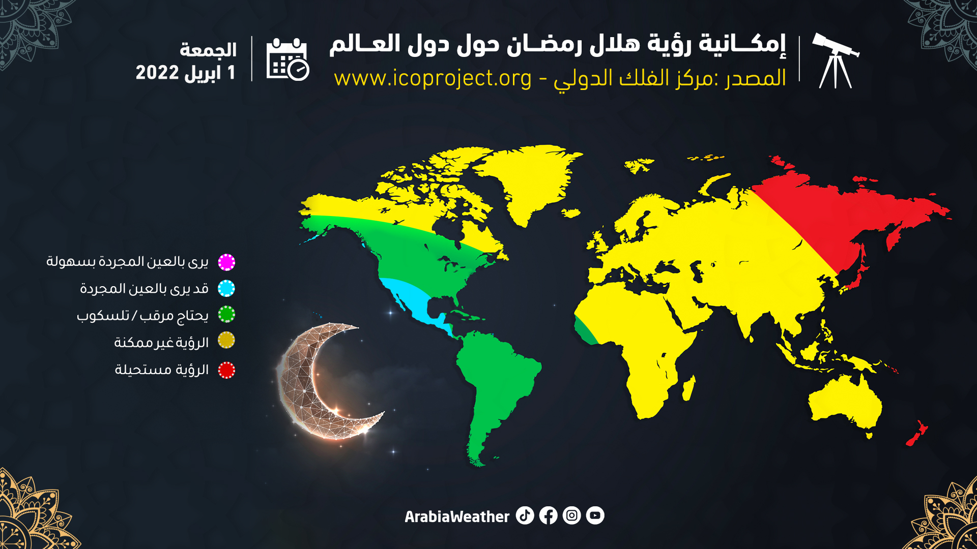 طقس العرب - يتحرى دول العالم الاسلامي التي تعتمد رؤية الهلال، بداية شهر رمضان بعد مغيب شمس يوم الجمعة 1 إبريل/نيسان 2022 ، حيث تشير الحسابات الفلكية أن الهلال سيتولد الساعة 09:24 صباحاً بتوقيت مكة المكرمة، وسيكون عمر الهلال وقت التحري قرابة 9 ساعات، وسيمكث ما بين 13 - 26 دقيقة في سماء عواصم الدول العربية.