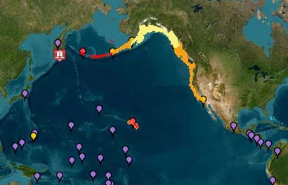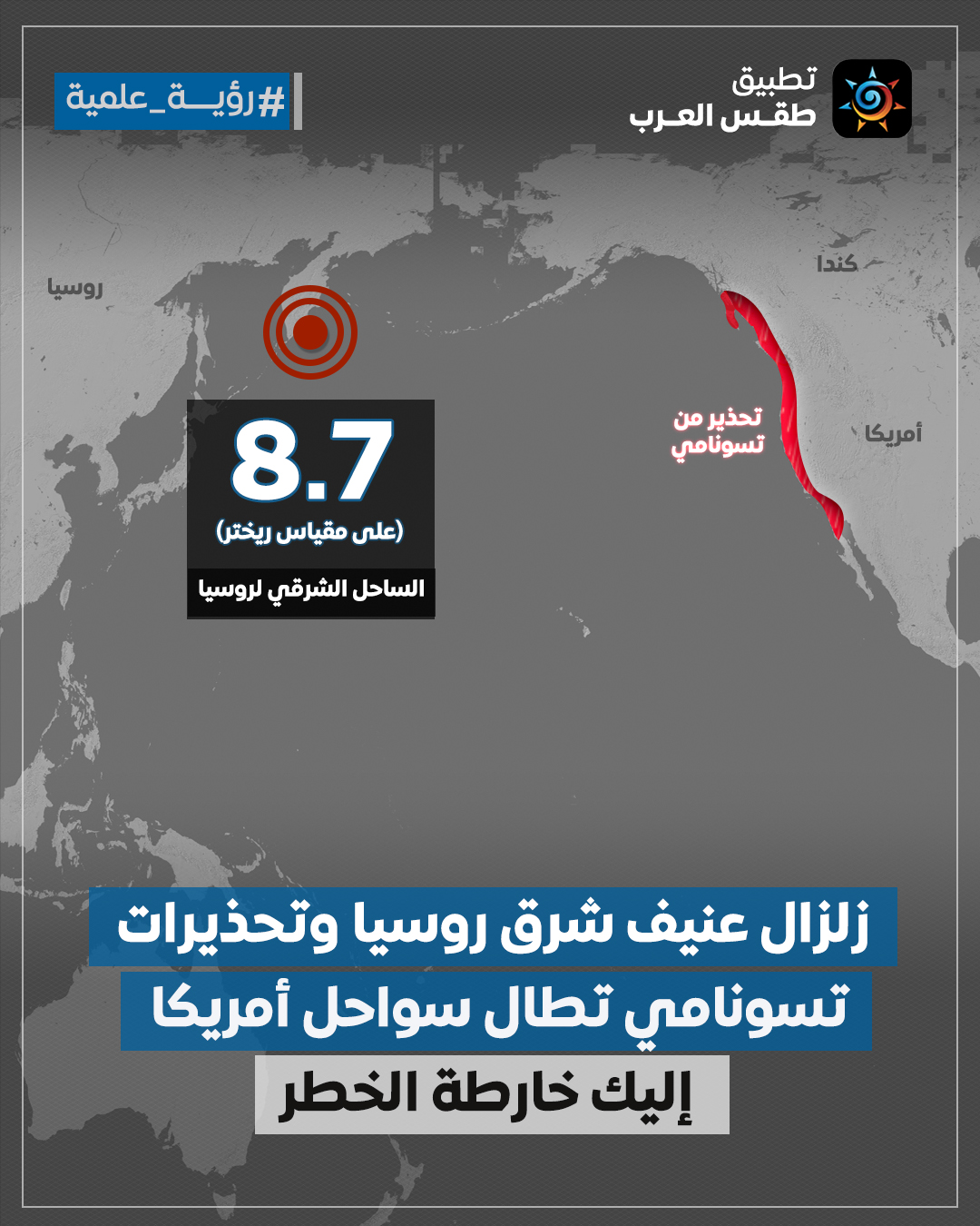 طقس العرب - ضربت نهار اليوم الأربعاء موجات تسونامي بعض المناطق على طول سواحل روسيا واليابان بالإضافة للسواحل الغربية لأمريكا، وتشكلت موجات تسونامي بعد الزلزال العنيف الذي ضرب شرق روسيا وبلغت قوته 8.8 على مقياس ريختر.