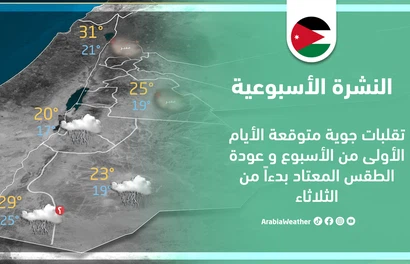 ويُتوقع غدًا الأحد ان يسود طقس مغبر وغير مستقر حيث تتهيأ الظروف تدريجياً لهُطول زخات رعدية من المطر في أنحاء متفرقة من المملكة وخاصة الأجزاء الجنوبية قد تكون غزيرة أحياناً، وتترافق مع تدني واضح وكبير في مدى الرؤية الأفقية واحتمال تساقُط زخات من البَرَد ، وتستمر الأحوال الجوية غير المستقرة يوم الإثنين أيضًا حيث يسود طقس غير مستقر ومغبر يترافق مع زخات رعدية من الأمطار في أجزاء متفرقة من المملكة وتتركز في المناطق الجنوبية والجنوبية الغربية وتكون غزيرة أحيانًا ومترافقة مع تشكل العواصف الرملية محليًا وتساقط البَرَد.