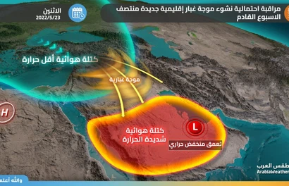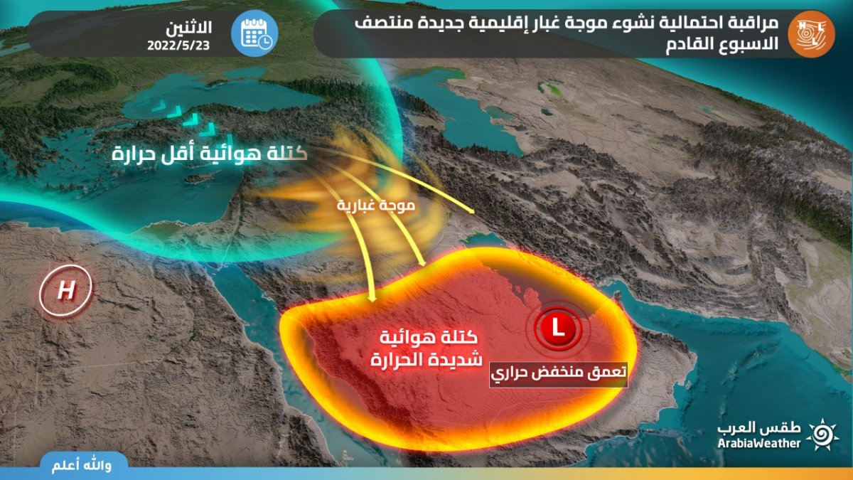 طقس العرب - سنان خلف - بات في حُكم المؤكد بعد مشيئة الله تأثر المملكة العربية السعودية مُجدداً يومي الإثنين والثلاثاء بأحوال جوية غير مستقرة، على شكل موجات غبار واسعة عالي الكثافة، مترافقة بتدني كبير وشبه وانعدام لمدى الرؤية الأفقية في العديد من المناطق.