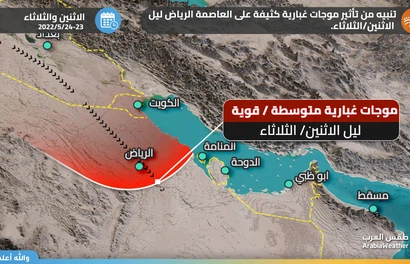 وينبه موقع طقس العرب من خطر تزايد نسب الغُبار وتأثير ذلك على مدى الرؤية الأفقية في العاصمة الكويت وبقية المناطق خلال الفترة القليلة القادمة.