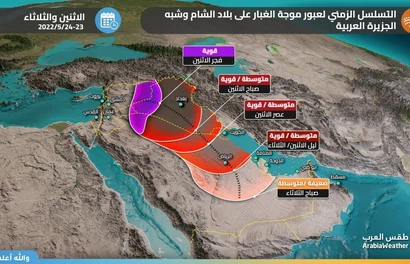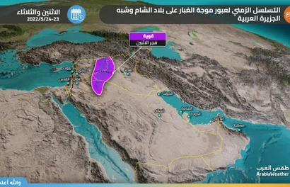 طقس العرب - من المُنتظر أن ترتفع نسب الغُبار في الأجواء في مناطق عِدّة من شبه الجزيرة العربية يومي الإثنين والثلاثاء 23 و24 مايو 2022، ويكون الغبار متفاوت الشدة بين الخفيف والمُتوسط والكثيف أحياناً ويشمل تأثير موجات الغُبار 7 دُول عربية.