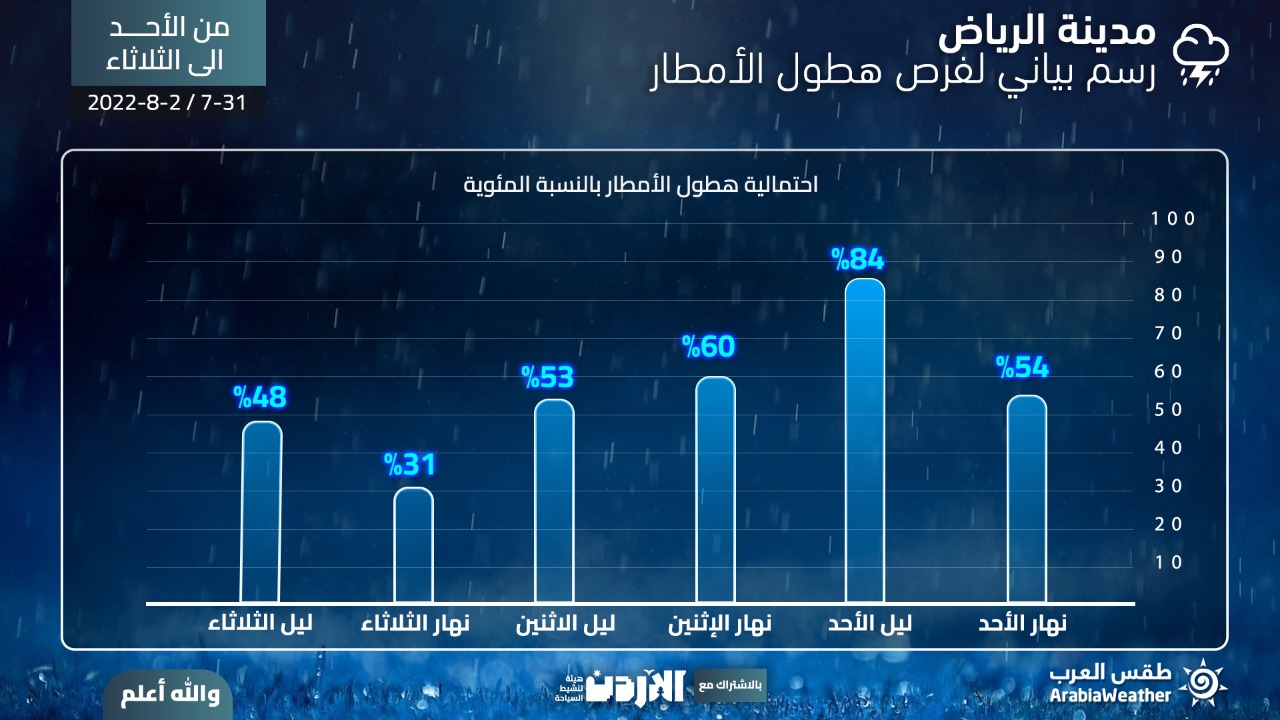 وبحسب ما تُشير إليه مُخرجات النمذجة الحاسوبية المُطورة من قبل طقس العرب فيُتوقع إستمرار تدفق بخار الماء الإستوائي للمُرتفعات الغربية من المملكة، مما يعني تكاثر السُحب الرعدية فترة الظهر والمساء وهطول زخات من المطر في أجزاء من القطاع الجنوبي الغربي من المملكة بما في ذلك مُرتفعات جازان وعسير والباحة وجنوب منطقة مكة المُكرمة ولا يُستبعد أن تُطال فُرص الأمطار مدينة الطائف، كما وتشمل فُرص الأمطار أجزاء من عِدّة من منطقة المدينة المُنورة، ومناطق عشوائية من تبوك وحائل والجوف وبشكلٍ محدود القصيم، وتكون الأمطار مُتفاوتة الشدّة وغزيرة أحياناً وقد تتسبب في جريان الأودية في بعض المناطق خاصةً القطاع الجنوبي الغربي بالإضافة إلى أنها تُسبق في العديد من الأحيان بنشاط كبير في سرعة الرياح التي قد تتسبب في تشكل عواصف تُرابية محلية.
