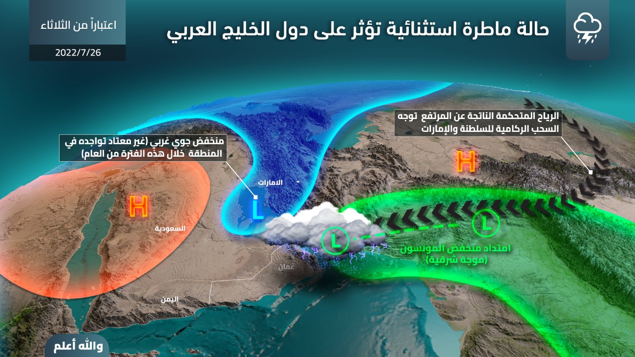 طقس العرب - تدخل مناطق جنوب شرق الجزيرة العربية بما فيها المناطق الشمالية من سلطنة عُمان تحت تأثير حالة جوية ماطرة مُميزة يوم الثلاثاء 25-7-2021، إثر سلوك غير إعتيادي وإستثنائي تشهدها المنظومة الجوية في المنطقة تتمثل بإستمرار إمتداد مُنخفضات جوية من شبه القارة الهندية لأجواء السلطنة ومُترافقة بكميات كبيرة من بخار الماء ذو الخصائص الإستوائية.