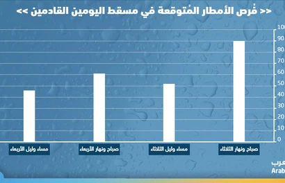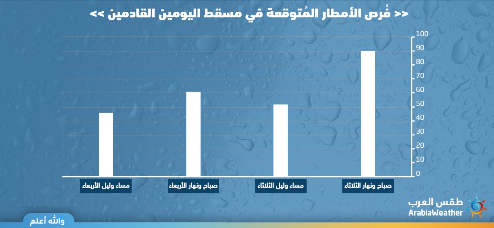 رسم بياني يوضح فُرص هطول الأمطار خلال اليومين القادمين على العاصمة مسقط