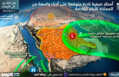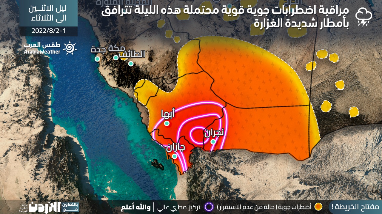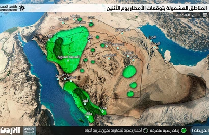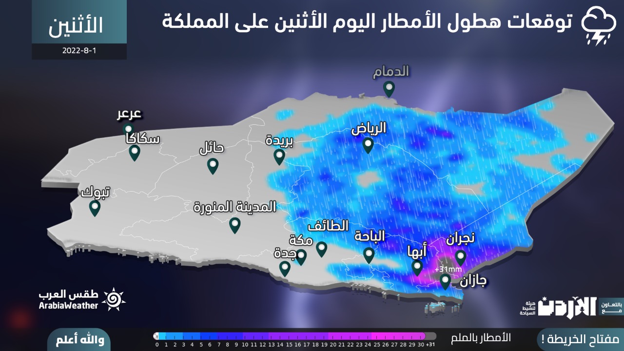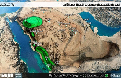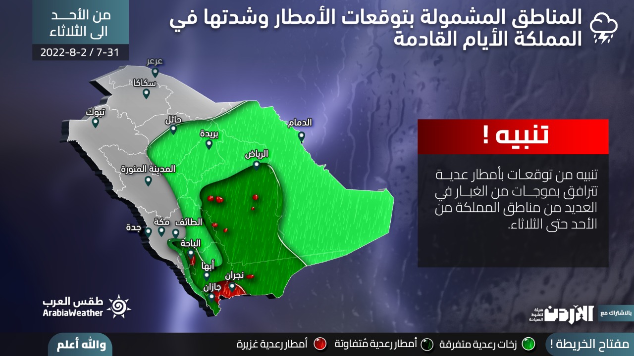طقس العرب - أفاد المُتنبئون الجويون في مركز طقس العرب أن الحالة الجوية الماطرة المؤثرة على القطاع الغربي من المملكة منذُ عِدّة أيام، يُتوقع أن تستمر بشكلٍ يومي خلال الأسبوع الجاري بإذن الله. بحيث يتجدد تأثير الإضطرابات الجوية يوم الإثنين 8-8-2022 اعلى أجزاء مُتفرقة من غرب وشمال غرب المملكة تُسبب هطول أمطار رعدية تكون غزيرة في بعض الأنحاء بمشيئة الله.