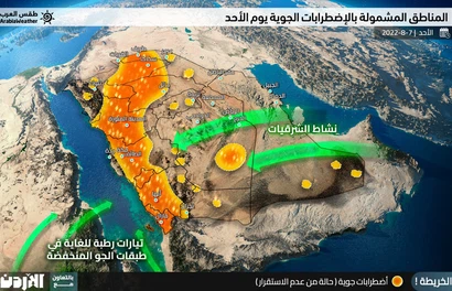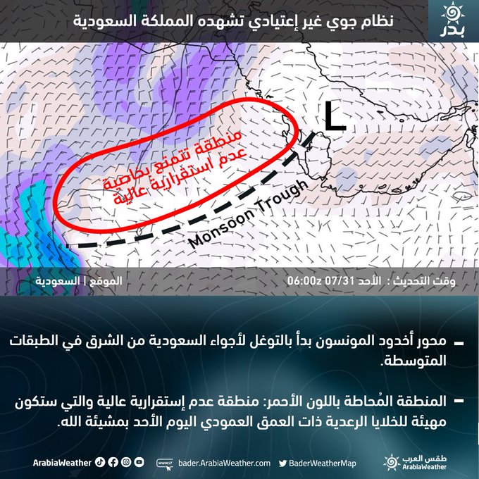 طقس العرب - تُشير أحدث التنبؤات الجوية المُستخرجة من نواتج ما يُسمى بالمُحاكاة الحاسوبية إلى إستمرار مُتوقع في الإضطرابات الجوية على أجزاء واسعة من غرب وشمال غرب المملكة السعودية خلال الأيام القادمة. حيثُ تسود الشرقيات خلال أشهر الصيف، ونتيجة لسيطرة تلك الرياح، فإن السحب الرعدية التي تتشكل على المرتفعات مع ساعات الظهر و العصر، تندفع نحو الغرب (بِخلاف أشهر الخريف والشتاء)، وبذلك يشمل تأثيرها التهامة وبعض السواحل بِحدة مُتفاوتة من يوم إلى أخر على غِرار الأيام القليلة الماضية.