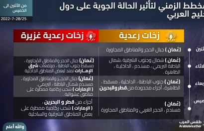 وحول التفاصيل، تُشير الخرائط الجوية إلى توقعات بتركز تأثير الحالة الماطرة يوم الأربعاء 27-7-2022 على محافظة مسندم وأجزاء من شمال الباطنة، لتهطل أمطار مُتفاوتة الغزارة بمشيئة الله وتكون مُترافقة مع حدوث العواصف الرعدية وتساقط لزخات من البَرَد، ولا يُستبعد تسجيل كميات كبيرة من الأمطار قد تتجاوز حاجز 80 ملم في أجزاء من تلك المناطق، ما يؤدي إلى تشكل السيول، وجريان الأودية والشِعاب بالإضافة إلى ارتفاع منسوب المياه. في حين يُتوقع استمرار فُرص هطول زخات مُتفرقة من المطر على أجزاء من مسقط وجنوب الباطنة والبريمي والحجر الغربي والمناطق المُجاورة به قد تكون غزيرة أحياناً.