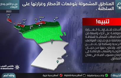 يُذكر أن التوقعات الجوية تشير إلى تأثر أجزاء واسعة من سلطنة عُمان اعتباراً من ليل الاثنين/الثلاثاء بأحوال جوية غير مستقرة، تتكاثر خلالها السحب الرعدية وتتساقط الأمطار في نطاقات واسعة، تترافق بالسيول.