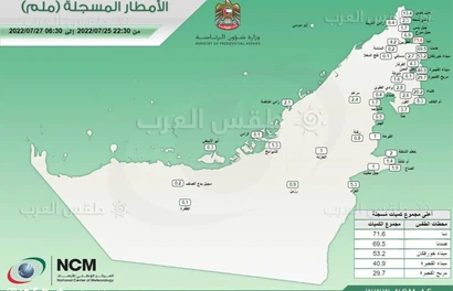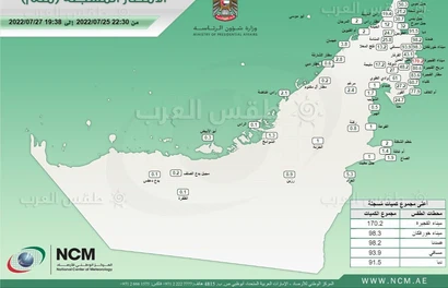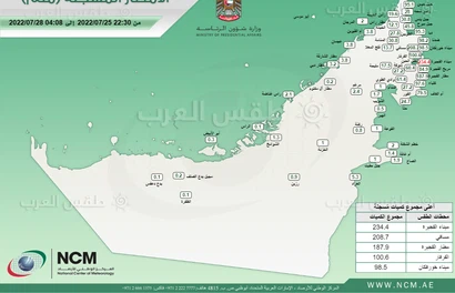 طقس العرب - حذر المركز الوطني للارصاد الجوية في دولة الإمارات من تكون سحب ركامية ممطرة على بعض المناطق الشرقية وقد تمتد على بعض المناطق الداخلية يصاحبها رياح نشطة السرعة وقوية أحياناً وتصل سرعتها 50 كم/س مثيرة للغبار والاتربة تؤدي الى تدني مدى الرؤية الافقية أحياناً وذلك حتى الساعة 00:00 الخميس 28/07/2022