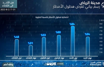 وتُشير نواتج التحليلات داخل مركز "طقس العرب" الإقليمي للأرصاد بالإضافة إلى مُخرجات المُحاكاة الحاسوبية بأن فرص الأمطار على مدنية جدة خلال اليومين القادمين كما يلي :