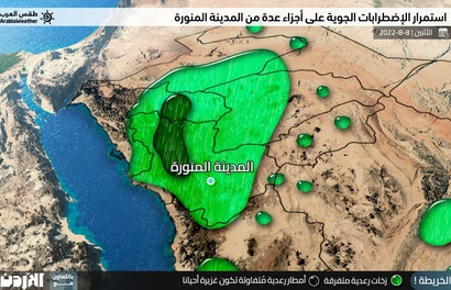 طقس العرب - أفاد المُختصون في قسم العمليات الجوية في مركز طقس العرب الإقليمي أن الأحوال الجوية غير مُستقرة التي تتأثر بها المدينة المُنورة ستتجدد على فترات مُختلفة خلال الأيام المُقبلة، بحيث يستمر تقلب الأجواء ما بين الغائمة جزئياً والغائمة مع بقاء الفرصة مُهيأة لهطول زخات رعدية من الأمطار بمشيئة الله في مناطق مُتفرقة من منطقة المدينة المُنورة وقد تكون غزيرة في بعض الأحياء.