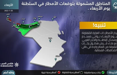 وبحسب المُحاكاة العددية للغلاف الجوي، يُتوقع أن ىتراجع رُقعة الهطولات المطرية في السلطنة يوم الأربعاء 26-7-2022 بحيث تتركز الأمطار نواحي مسندم وشمال وجنوب الباطنة والبريمي مع بقاء فُرص هطول زخات مُتفرقة من المطر واردة في باقي المُحافظات الشمالية.