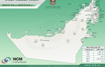 فيما سجل مطار الفجيرة 153ملم، ومنطقة مسافي 117.8ملم، تلاها ميناء خرفكان وضدنا بكميات امطار كبيرة ايضاً وصلت إلى أكثر 98 ملم.