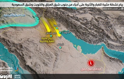 وينتج عن توزيع الكُتل الهوائية بهذا الشكل إلى هُبوب رياح شمالية غربية نشطة السرعة مع هبات قوية أحياناً من جنوب شرق العراق مروراً بأجواء الكويت خاصةً الغربية منها ووصولاً لشمال المنطقة المنطقة الشرقية بما فيها حفر الباطن، وتمتد لبعض المناطق الوسطى، ويُتوقع أن تعمل هذه الرياح على إثارة الأتربة وتدني في مُستويات الرؤية الأفقية في بعض من المناطق المذكورة سلفاً وذلك خلال الأيام القادمة بمشيئة الله.