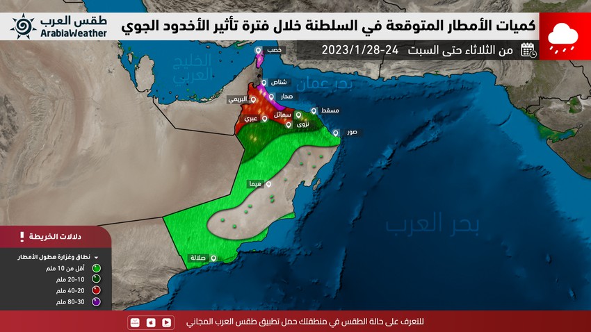 وقد حذر المركز الوطني من رياح جنوبية شرقية نشطة السرعة وتصل سرعتها 40 كم/س والبحر مضطرب الموج أحياناً ويصل ارتفاع الموج 6 قدم أحياناً في عمق بحر عمان وذلك من الساعة 05:00 الأربعاء 25/01/2023 وحتى الساعة 05:00 الخميس 26/01/2023.