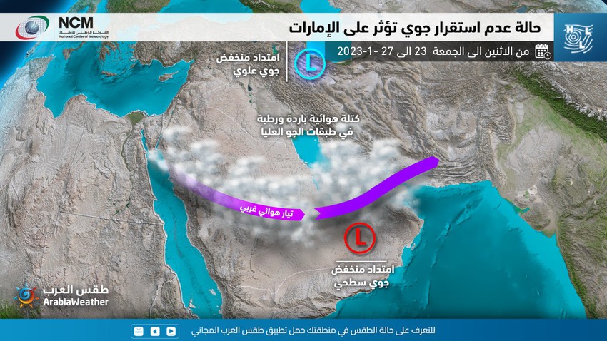 طقس العرب - أشار المركز الوطني للأرصاد بأن دولة الإمارات تتأثر بمرور امتداد منخفض جوي سطحي من الجنوب الغربي مع امتداد منخفض جوي علوي من الشمال يُصاحبه تيار هوائي من الغرب و كتلة هوائية باردة و رطبة في طبقات الجو العليا. و بحسب المركز من المُنتظر أن يتعمق المنخفض الجوي في طبقات الجو العليا تدريجياً بحيث تنشأ حالة من عدم الاستقرار الجوي تؤثر على الدولة يومي الأربعاء و الخميس و تترافق بانخفاض ملحوظ على درجات الحرارة و تكاثر للسُحب و هطول أمطار مُختلفة الغزارة على مناطق مُتفرقة من الدولة بمشيئة الله.