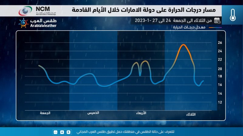 أما يوم الخميس 26-1-2023، فمن المُتوقع أن يستمر تأثر الدولة بحالة عدم الإستقرار الجوي، بحيث يطرأ انخفاض ملحوظ على درجات الحرارة، و يكون الطقس غائم جزئي إلى غائم و تتخللها بعض السُحب الركامية مصحوبة بهطول أمطار مُختلفة الغزارة مع حُدوث البرق و الرعد على مناطق مُتفرقة، و الرياح جنوبية شرقية إلى شمالية شرقية معتدلة إلى نشطة السرعة وقوية أحياناً مع أحيانا السحب الركامية مثيرة للغبار، والبحر مضطرب الموج في الخليج العربي وفي بحر عمان.