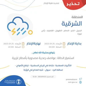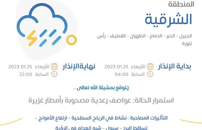 طقس العرب - سنان خلف رفع المركز الوطني للأرصاد مستوى التنبيه في المنطقة الشرقية إلى تحذير، بالتزامن مع تزايد تأثر المنطقة بأحوال جوية غير مستقرة.