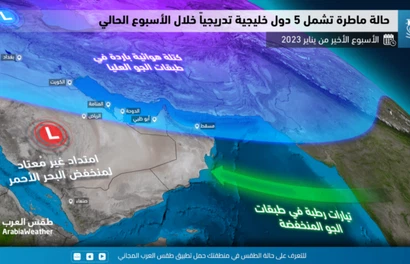 طقس العرب - تُشير آخر الخرائط الجوية المُستلمة من المراكز العالمية و الأخرى تلك المُطورة من طقس العرب داخلياً، بتزايد تأثر دُول الخليج تدريجياً بأحوال جوية غير مستقرة، ناتجة عن تلاقي إمتداد سطحي لمنخفض البحر الأحمر بالتزامن مع وجود كتلة هوائية باردة في طبقات الجو العليا، إضافة لوجود تدفق للرطوبة من بحر العرب.
