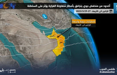 و تُشير أخر التحليلات الجوية في مركز طقس العرب بأن مع تحرك المُنخفض الجوي في طبقات الجو العليا للشرق يومي الإثنين و الثلاثاء 27 و 28 مارس 2023 سيؤدي إلى تركز تأثير الحالة الماطرة على الإمارات و سلطنة عُمان بالإضافة لأقصى جنوب المنطقة الشرقية في المملكة السعودية.