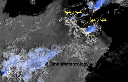 "تحرك الخلايا الرعدية الماطرة شمال شرق باتجاه (الخابورة وصحم) شمال الباطنة وتحرك الخلية الرعدية الماطرة من ازكي ونزوى باتجاه (قريات ودماء والطائيين وابراء) مع فرص لأمطار رعدية تشكل السحب على جبال الحجر والمناطق المجاورة والمناطق الصحراوية مع فرص لأمطار متفرقة"