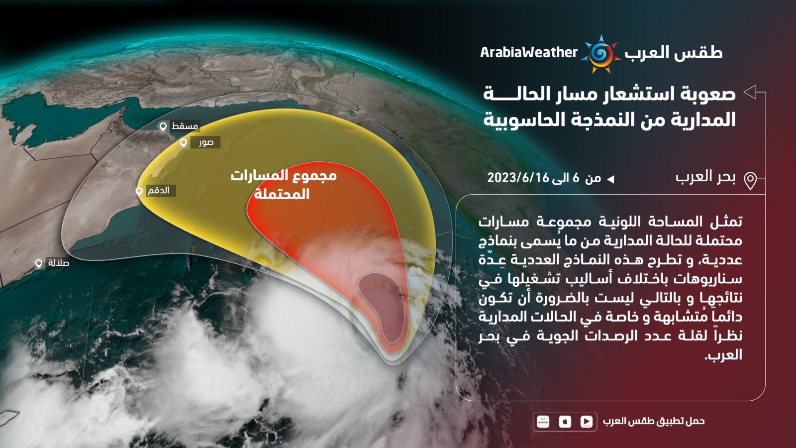 طقس العرب - يُتابع المختصون في مركز طقس العرب الإقليمي عن كثب آخر تطورات الحالة المدارية في بحر العرب عبر صور الأقمار الاصطناعية المُستَلَمة و ما يُسمى أيضاً بالنماذج العددية و التي تقوم باستشعار حركة الحالة المدارية باختلاف أساليب تشغيلها و بالتالي تطرح هذه النماذج عِدّة سناريوهات ليست بالضرورة أن تكون مُتشابهة. و تقوم هذه النماذج و التي تُشغل عبر حواسيب فائقة القُدرة بمعرفة الحالة المبدئية للغلاف الجوي من خلال الرصدات الجوية، و بالتالي تعاني الأمرين من محاكاة و استشعار حركة الحالة المدارية نظراً لضعف البيانات و قلة الرصدات الجوية و البحرية ذات الجودة بالمسطحات المائية بما فيها بحر العرب بالإضافة إلى أن الحالات المداري نظام مُعقد يؤثر عليه العديد من المُتغيرات الجوية.
