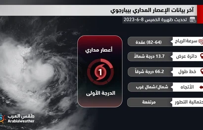 طقس العرب - أصدر "مركز طقس العرب الإقليمي" نشرة جوية خاصة تتضمن آخر التوقعات الجوية الخاصة بحركة ومسار الإعصار بيبرجوي في بحر العرب، والذي يُتوقع أن يصل للفئة الثانية في قوية خلال الساعات القادمة .. التفاصيل في النشرة المرفقة: